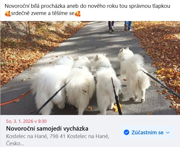 V sobotu 3. ledna pořádáme se spolkem Samojedi-CZ novoroční procházku v Kostelci na Hané https://www.facebook.com/events/1186168633481775. Těšíme se na všechny!!!🥰